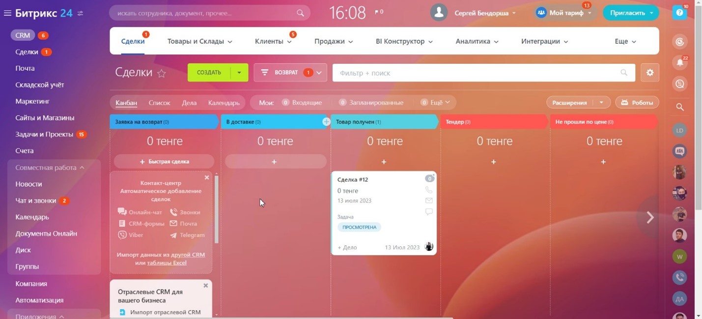 Заявки из почты, сайта, онлайн-магазина на маркетплейсе, мессенджера автоматически сгружаются в «Битрикс24». Система самостоятельно распределяет клиентов между менеджерами. Как только сотрудник заполнит обязательные поля карточки контакта, задача переходит на этап консультации.