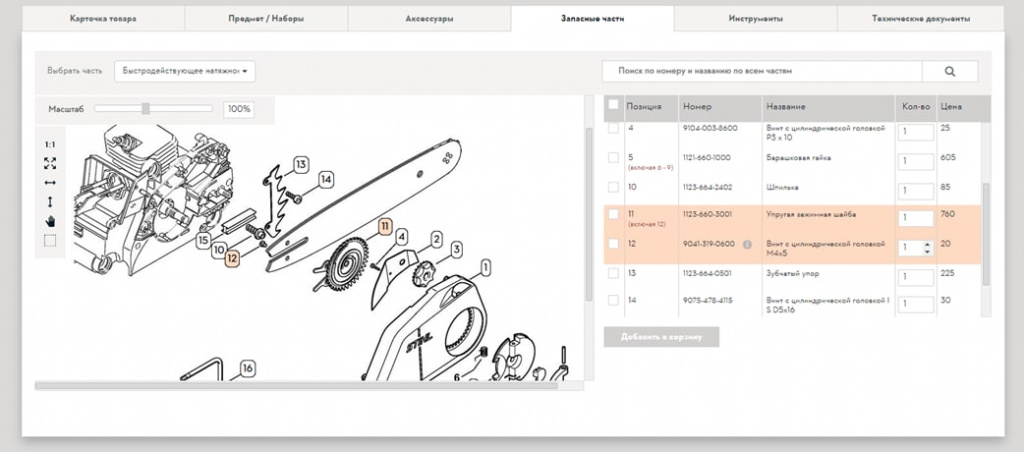 Кроме возможности покупки готового изделия у дилеров есть возможность купить отдельные узлы в сборе либо отдельные запчасти. Для удобства поиска запчастей дилер может использовать поиск по названию или артикулу либо воспользоваться интерактивными схемами, на которых после выбора узла можно визуально найти необходимую запчасть и добавить ее в корзину.