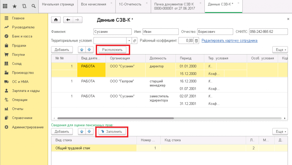 Далее заносятся имена сотрудников. Для каждого сотрудника требуется указать информацию о промежутках стажа вплоть до 01 января 2002 года. При помощи двойного нажатия мыши можно перейти к заполнению. Когда необходимые данные о стаже сотрудника записаны, нужно нажать «Расположить» и «Заполнить».