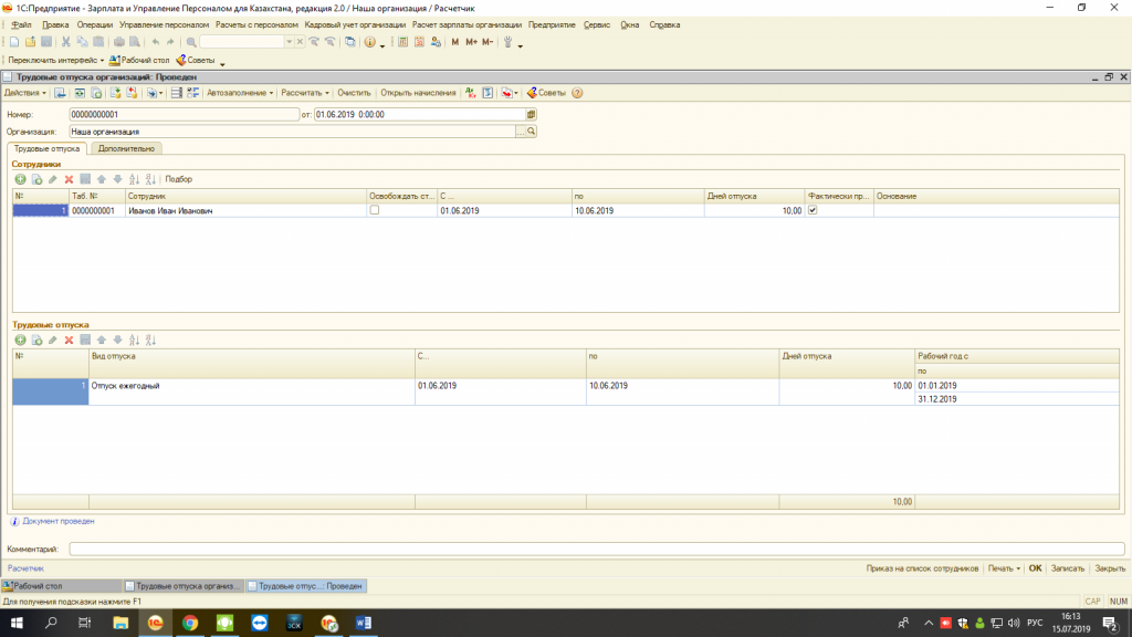 Удобнее и быстрее всего работать с отпускными в программе «1С:Зарплата управление персоналом 8 для Казахстана». В системе предусмотрен для этих целей специальный документ «Трудовые отпуска организации».